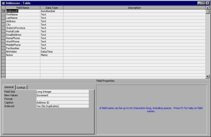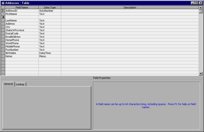To look at your table's structure (or design), select the table name from the Database window and then click your mouse on the Design button. Access, in turn, will display the Design view window shown in Figure 3-1.