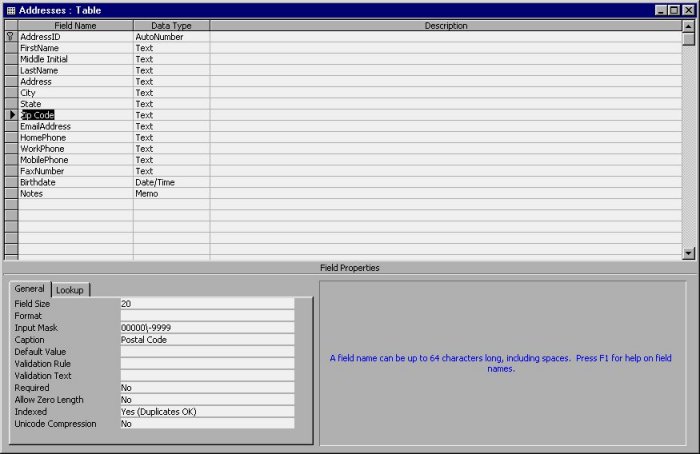 Your field names should describe the data that your fields contain. Over time, the information you store in a table may change. To change the name of an existing field, simply select the name and edit it. For instance, if you want to change the name of the PostalCode field to Zip Code, select the existing field name and type in Zip Code. Likewise, you may want to change the name of the StateOrProvince field to simply State. The resulting changes to your table structure (after adding the Middle Initial field and changing the StateOrProvince and PostalCode field names) are shown in Figure 3-3.