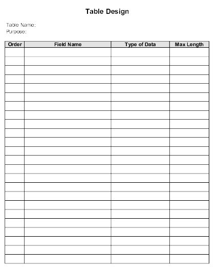 As mentioned in the previous section, the best way to design your table is with a pencil and paper. With that in mind, you might want to create a table design form you can use as you work on your design. Figure 4-4 shows an example of such a form.