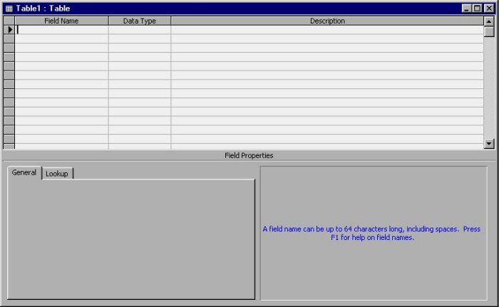 In Chapter 3 you learned how to use the Design view window to change the layout of an existing table. Here you will use it to create a new table. In this case, the Design view window is completely empty. Notice also that the cursor is blinking in the first row, in the Field Name column. Access is ready for you to layout your table.