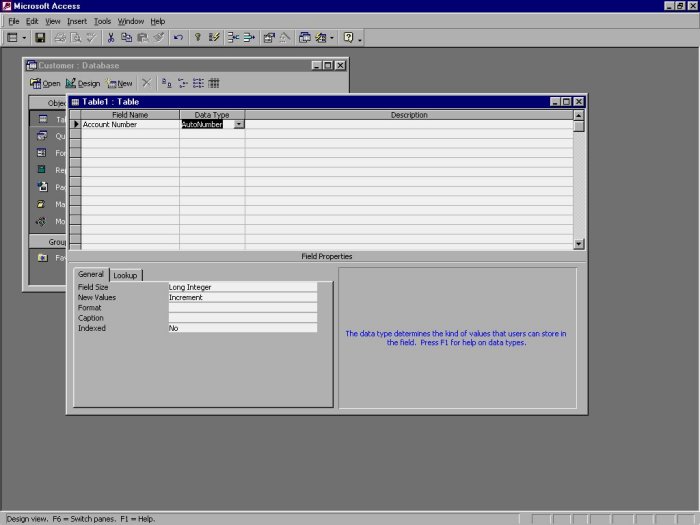 The cell should now display AutoNumber as the data type for the Account Number field. Your Design view window should look like the window shown in Figure 4-7. Also, notice that, along with the data type, Access has changed the field's properties.
