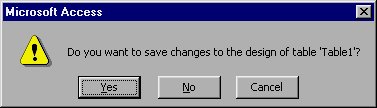 You have now laid out your entire table, and you are ready to save your work to disk. To save your table, simply close the Design view window. To do so, click your mouse on the Close button in the upper-right corner of the window. In response, Access asks if you want to save your work (see Figure 4-11).