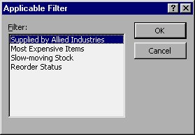 Enter the name by which you want to save this filter. The name can be any name you desire. As an example, if you want to save the filter that displayed the inventory items supplied by Allied Industries, you can use the name Supplied by Allied Industries. Type the name and press ENTER or click your mouse on the OK button.