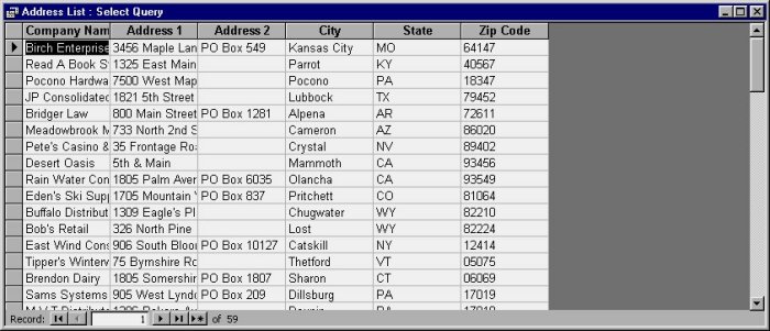 Here you can enter a name that you want used to save your query. The suggested name is simply the table name on which the query is based (Business Customers) to which the word "Query" is added. The simple query you created using the previous dialog box can be used as the basis for mailing labels, since it only contains the address information for your customer list. Enter the name Address List, and then click your mouse on Finish. Access displays the results of your query, as shown in Figure 6-6.