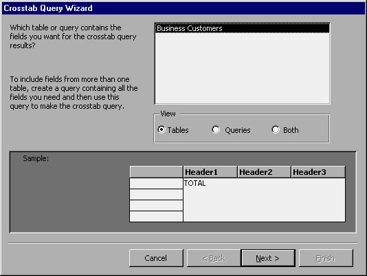At the top of the Crosstab Query Wizard dialog box, Access asks you to select the table from which you want to query data. Since this database has only one table (the Business Customers table), Access has already selected it for you. If you were working with a database that contained several other tables and queries, you could use the View area in the center of the dialog box to change what the Wizard displays as data sources.