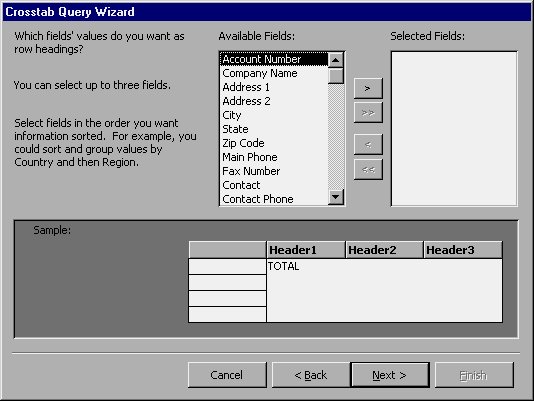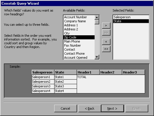 A Crosstab query lets you define what should appear in both the rows and columns of the resulting display. Using the Wizard, you should indicate which fields you want to appear in each row.