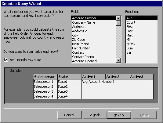 Finally, notice that there is a check box you can use to indicate whether the query should provide a summary for each row. For a simple crosstab that only has two real columns (active or inactive), a summary is probably unnecessary. Click your mouse on the check box to turn the summary off. After the selection is made, you can click your mouse on the Next button. Access will display the dialog box shown in Figure 6-12.