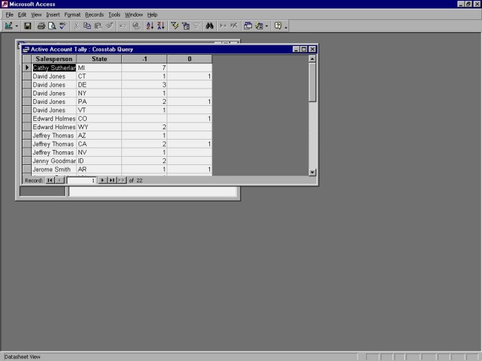 If you look past this oddity in the headings, you can see that the crosstab provides the information you requested. It shows the number of accounts on active (Yes, or -1) and inactive (No, or 0) status for each state and each rep. The Crosstab Query Wizard made it easy for you to create this view of your data.