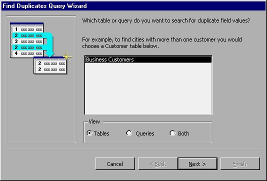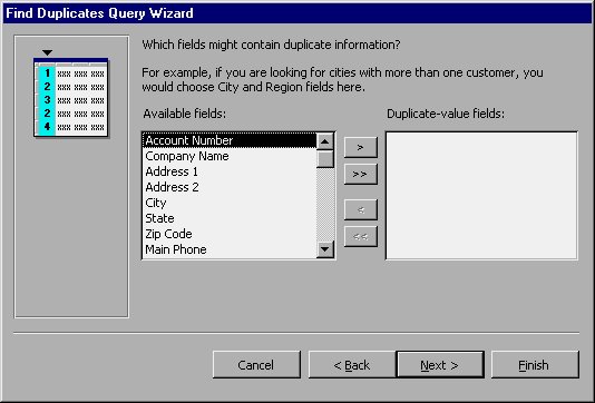 In this dialog box, Access asks you which fields you want to check for duplicate values. Although there is no limit to the number of fields you can have your query check, you should select only those fields necessary to ensure there are no duplicates. The more fields you ask your query to check, the longer it will take to run. In the case of the Business Customers table, you will probably only need to check the Company Name and Contact fields to determine if there are duplicates.