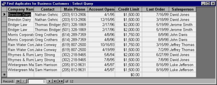 You can now review the duplicates and decide what you want to do with each of them. If you delete any record in the display, Access will delete the corresponding record in the underlying table (Business Customers). For this reason, Find Duplicates queries can be very helpful in managing the information in your table.