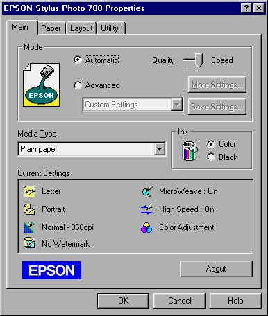 Figure 7-6 The Properties dialog box for the Epson Stylus Photo 700 printer.