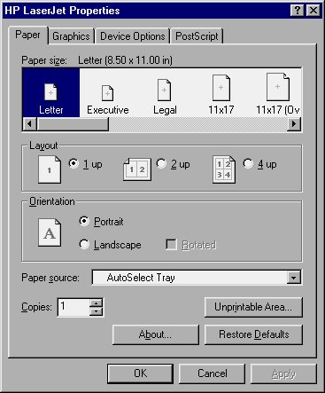 To provide a contrast, take a look at Figure 7-7. It shows the Properties dialog box for an HP LaserJet printer. Notice that the controls in this dialog box are completely different from those in Figure 7-6. This is, again, because the capabilities of the two printers are completely different.