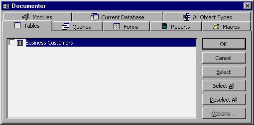 If you had a particular object selected before you invoked the Documenter, the type of object you selected controls which tab of the Documenter dialog box Access displays. You can specify a different object type, however, by simply clicking your mouse on the appropriate tab. Access then displays the defined objects that fit the category you selected.