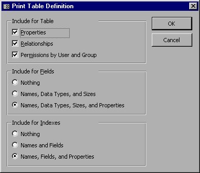 Note: If you choose to print the layout of different database objects (besides tables), Access replaces the Print Table Definition dialog box with an appropriate dialog box for the selected object type.