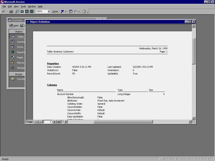 Now click your mouse on OK in the Documenter dialog box. Access examines your table (or other database objects you selected) and produces a definition printout. After a short time, Access displays the printout on your screen, as shown in Figure 7-10.