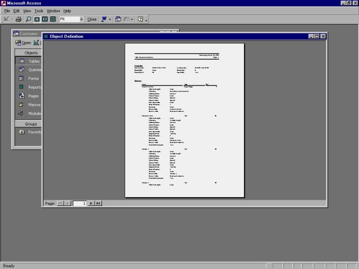 Before printing the definition to the printer, Access gives you a chance to see it on the screen. This viewing process is a print preview; it lets you make sure everything is OK before you actually print a copy of the printout. Notice that Access greatly reduces the number of toolbar tools at the top of the screen. There are only a few tools which you will typically use in this display: