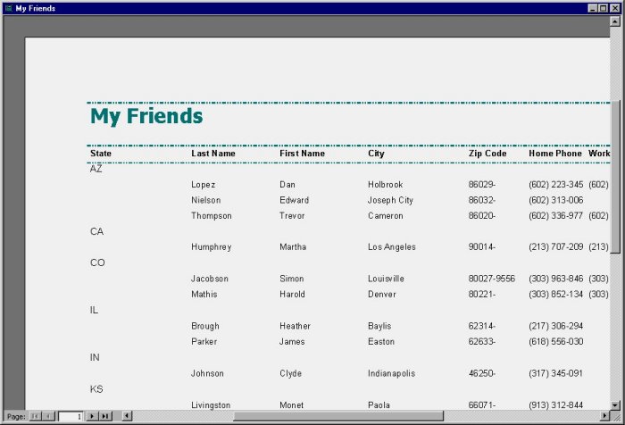 Now you need to decide how you want the information in your report sorted. Access allows you to specify up to four fields by which sorting can be done. In most instances you will use only one or two fields. It makes sense that if you are creating a list of your friends, you would want them in alphabetical order by name. Thus, you should choose the LastName and FirstName fields.