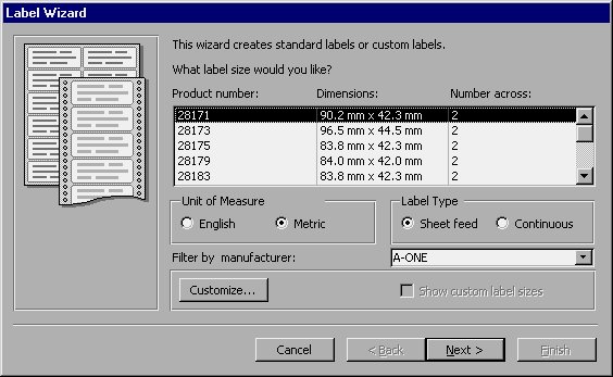 In this example, you are creating standard mailing labels (1" × 4"), two across. This is Avery label 5261. These labels let you print 6 lines per label and are designed for laser printers. Since this is a standard label size, it is also produced by many other vendors. For the purposes of this example, specify English measurements, Sheet Feed labels, and Avery as the manufacturer. Then select the 5261 labels.