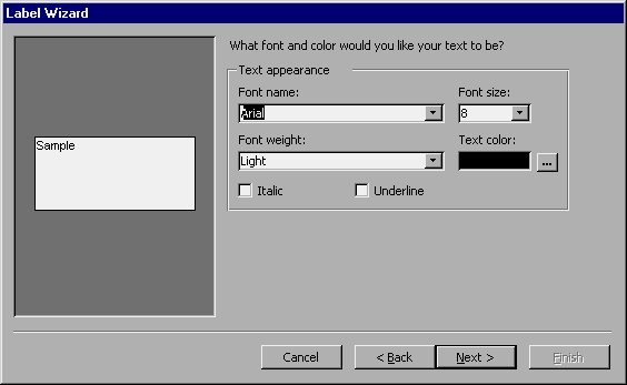 Click your mouse on the Next button to signify you are done selecting a label type. You are now ready to specify fonts and colors. As such, Access will display the dialog box shown in Figure 8-11.