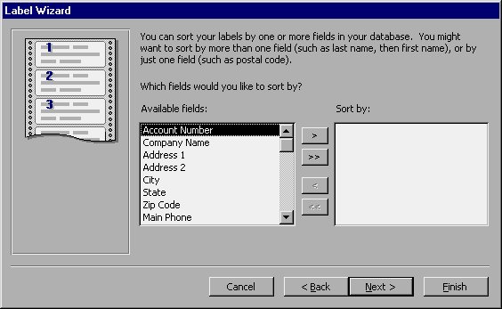 Typically, you will want to sort mailing labels by ZIP Code, but you can use any field you desire. In this example, we will do a two-level sort: first by ZIP Code, and then by company name. To do this, select each of these fields, in turn, followed by the > button. Both fields should appear on the right side of the dialog box.