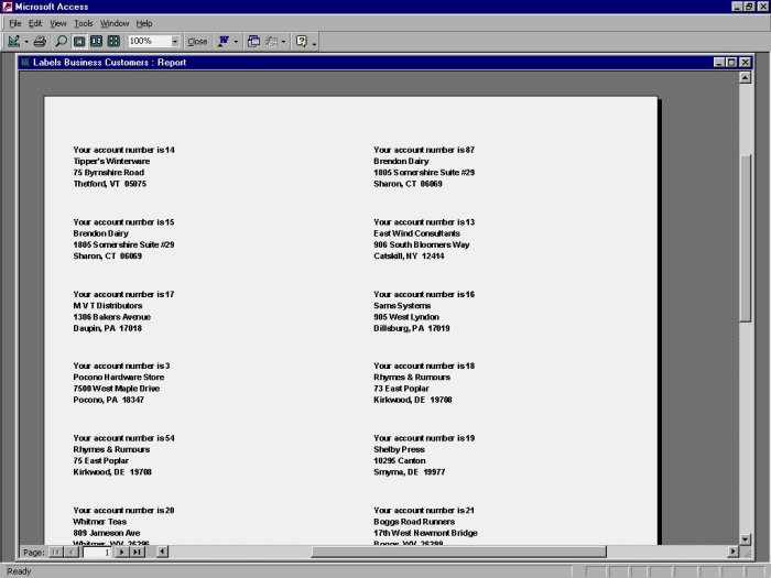 Because it is a good idea to see your mailing labels as they will look printed, there is nothing you need to change in this dialog box. Click your mouse on the Finish button, and Access displays a print preview of your mailing labels. Figure 8-16 shows what they should look like.