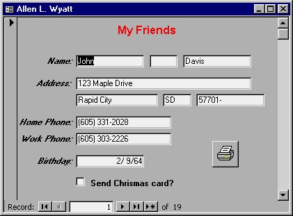 That is where forms come in. You can create forms that display part (or all) of your table. In addition, a form can contain information designed to aid input, such as on-screen help, buttons, or custom tools. There are many benefits to using forms. For example, the form shown in Figure 9-1 is one you will create later in this chapter. Notice that the form is much more attractive and useful (from a user's perspective) than the Datasheet.