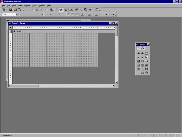 There are several items you should notice in this window. First, notice the toolbar has some new tools on it. You will learn the purpose of each tool later in this chapter. Second, notice the form Design toolbox. You will use the toolbox to put together your form. As such, the toolbox is described very shortly.
