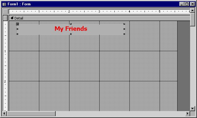 Access is now waiting for you to type the text that should appear in the label. Type the words My Friends, and then press ENTER. The text should appear at the left side of the box and handles will appear around the box. You can now set colors for the object. To make the box itself seem to disappear, so all you see is the text, set the background color (using the Fill/Back Color tool) and border color (using the Line/Border Color tool) either to the same color you used for the background of the form or to Transparent. You can then set the text color using the Font/Fore Color tool to something such as red.