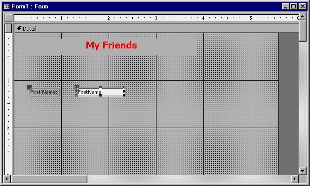 Now you are ready to place your fields on the grid. To begin, select the Field List option from the View menu. This displays the field list for your data source (the My Friends table). Next, use the mouse to select a field and drag it onto the form. For instance, click your mouse on the FirstName field and then drag it onto the form grid. When you release the mouse button, Access places two objects on the form: a Label and a Text Box. The Label contains the Caption property for the field, and the Text Box contains the name of the field itself, as shown in Figure 9-14.