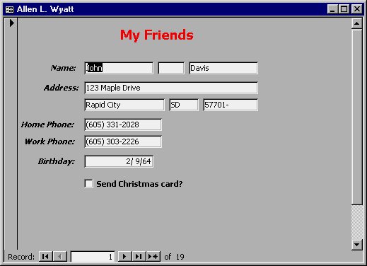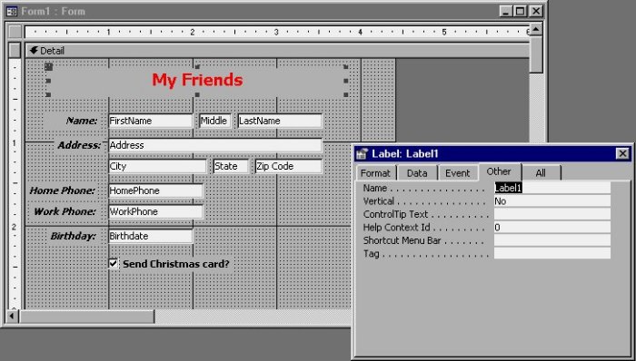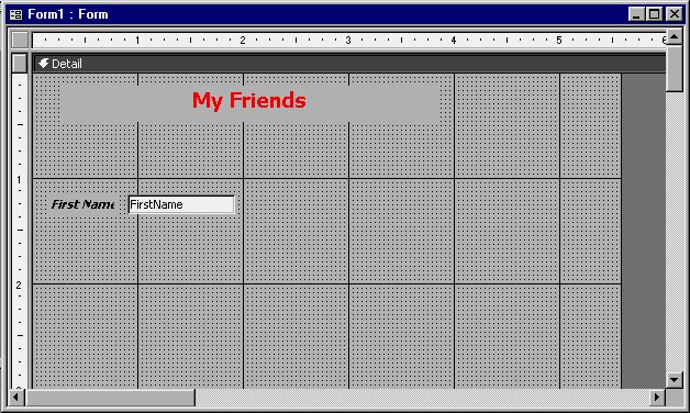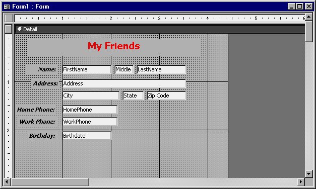 Many properties are useful only for advanced programming. However, you can use some of them immediately. For example, you may want to change the wording that appears in the title bar for your form. By default, the title bar will display the word "Form" followed by a colon and the name of the form. However, since you are working with the table that contains all your friends, you might want the title bar to display your name.