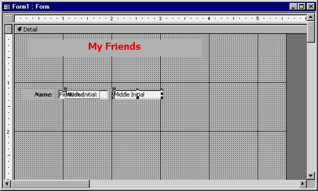 Now you are ready to place the field for the middle initial. You do this in the same manner that you placed the field for the first name. Simply click your mouse on the field name (Middle Initial) in the field list and drag the name onto the form grid. Position the mouse pointer so it is just a little to the right of the Text Box used for the FirstName field. When you release the mouse button, Access places the two objects on the form, as shown in Figure 9-16.