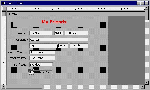 That's basically all there is to placing fields on your form. You should go ahead and place the rest of your fields, positioning them and changing their attributes so they look good. Use the same techniques you learned in placing the first three fields. (Don't place the Christmas Card field yet; it will be covered in the next section.) Figure 9-18 shows what the completed Design window should look like (minus the Christmas Card field, of course).