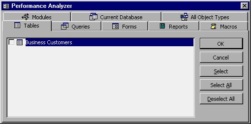 The Performance Analyzer allows you to examine virtually any object in your database. You can use the tabs in the dialog box to display the different objects available. To see how the Performance Analyzer works, select the Business Customers object by clicking your mouse on the check box to the left of the object name. You should then click your mouse on the OK button.