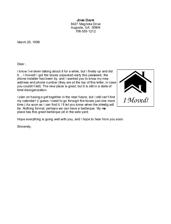 In preparation, you prepare an upbeat note in Word (see Figure 11-1). Your letter is formatted just the way you want it, and you have left room to later insert your friends' names and addresses. You save this document on your hard drive as Moved.doc.