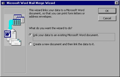 The first step is to use the Word Mail Merge Wizard, which is provided with Access. This Wizard helps you transfer information into a format you can use with Word. To start the Wizard, follow these steps:
