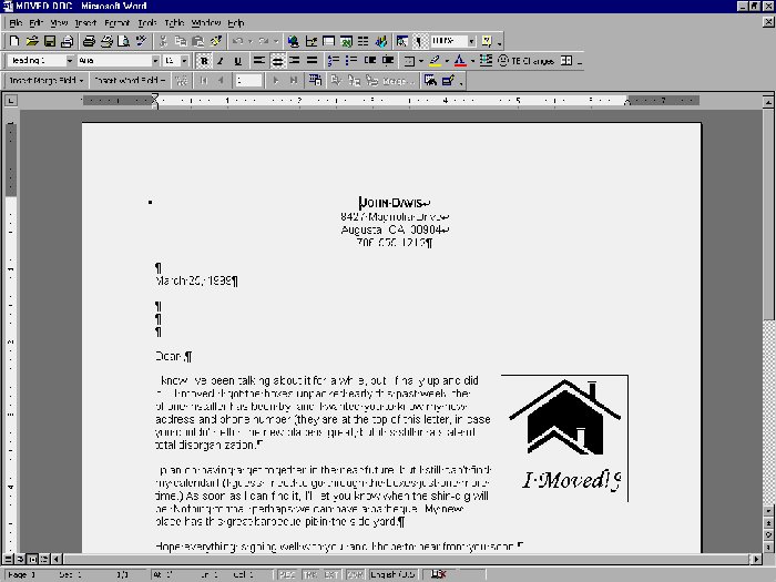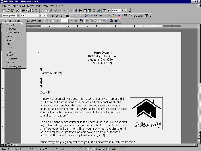 The Access Mail Merge Wizard causes Word to run and load the document Moved.doc. Once Word is running, you should notice the Word task on your taskbar, even if you cannot see the Word program window on your screen. To display your document, switch to Word by clicking your mouse on the Word task on the taskbar. You may then need to maximize the Word program window so you can fully see the document on which you are working.