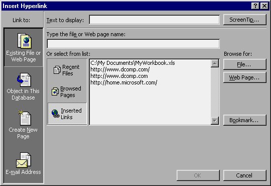 The Insert Hyperlink dialog box may look overwhelming at first, but it is really quite manageable if you remember that there are only two things you need to provide: text for your hyperlink and an address. In fact, if the field you selected before displaying the Insert Hyperlink dialog box had any text in it, the Text To Display field should already be filled in. The text you specify (or accept) in this field is what ends up underlined and "clickable" in the field.