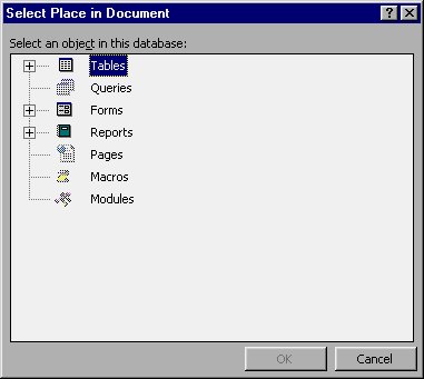 You are still not done, however. Remember that you wanted your link to specify a form in the database. To specify a particular query, click your mouse on the Bookmark button. Access displays the Select Place in Document dialog box, as shown in Figure 12-5.