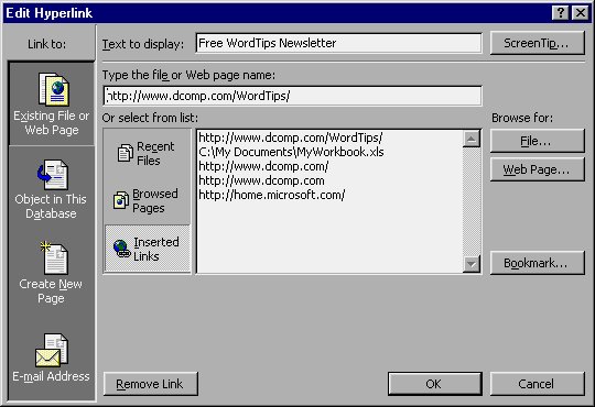 If you are more of a keyboard-oriented person, all you need to do is select the field in which the hyperlink is located and press the DEL key. You cannot select the field, however, by clicking on it with the mouse; trying to do so is the same as activating the hyperlink. Instead, you must select a field adjacent to the hyperlink field, and then use the arrow keys to select the field whose hyperlink you want to delete.
