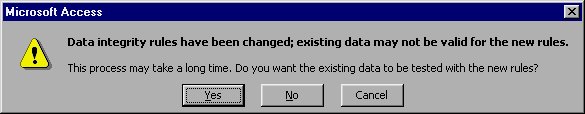 You can now close the Relationship window by clicking your mouse on the Close icon at the upper-right corner of the window. Access will ask you if you want to save your change to the table layout. Click your mouse on the Yes button, and Access will save your work, returning you to the Database window. Your two tables are now related.
