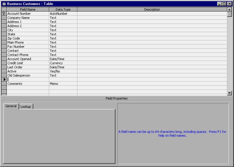 You accomplish both of these tasks from the Design window. From the Database window, click your mouse on the Business Customers table name and then click on the Design button. Access will display the Design window, containing the layout for the Business Customers table. Change the name of the Salesperson field to something like Old Salesperson.