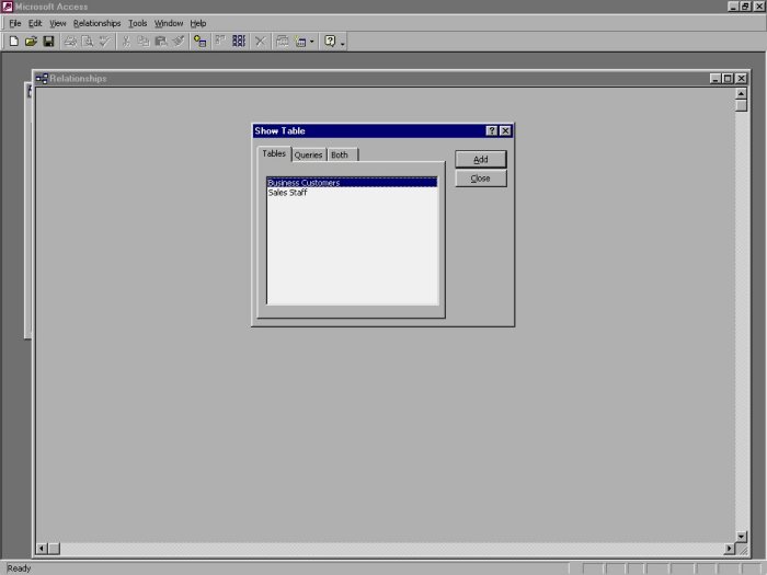 Notice that Access lists both of the tables in your database in the Show Table window. You use this window to select the tables or queries between which you want to establish relationships. All you need to do is select each table, in turn, and then click your mouse on the Add button. Access will display field lists for each table in the Relationships window. When you have added both tables, click your mouse on the Close button. The Relationships window will now appear as shown in Figure 13-10.