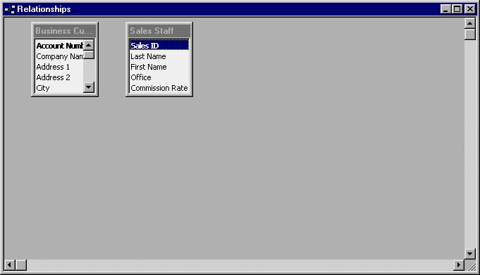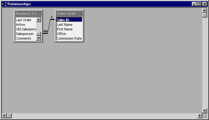 As you determine how to place the links between the two tables, it is important to remember the type of relationship that exists between the two. For each record in the Business Customers table, there is one corresponding record in the Sales Staff table. This is natural; our company assigns only one salesperson to each customer. Looking at it from the perspective of the Sales Staff table, however, there can be multiple records from the Business Customers table that correspond to each record in Sales Staff. Again, this is natural. There can be multiple accounts assigned to each salesperson. Understanding how the records relate, it is easy to see that this is a one-to-many relationship.
