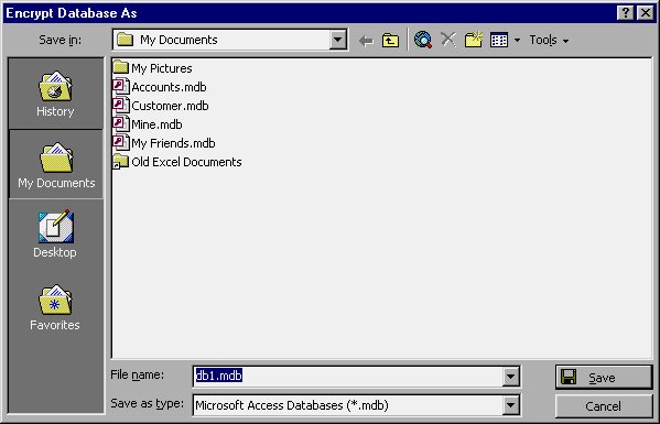 Here you need to supply a name (and optionally a different location) for the encrypted database that Access is going to create. The original database is not affected; only the newly created file is encrypted. Once a name has been provided, clicking your mouse on the Save button starts the actual encryption process. When completed, you have two versions of the database: one encrypted and one not. From this point you should use one or the other, but not both. Remember that you can still use an encrypted database in Access, the same as you would use a regular database.