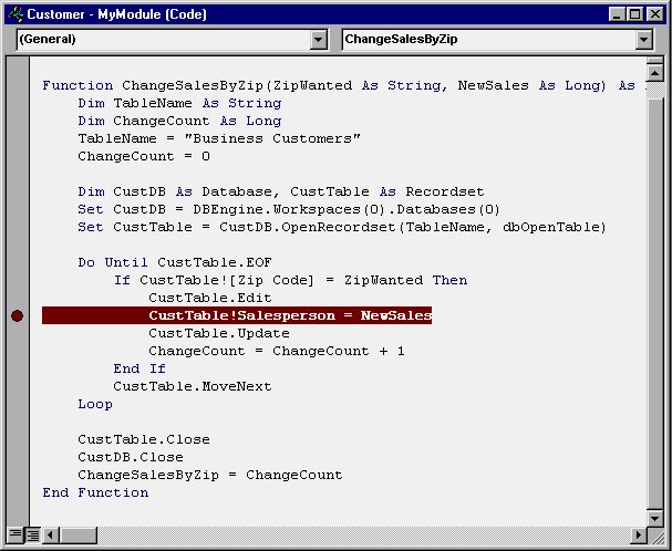 Another testing tool which VBA provides for you is a breakpoint--a place you specify within your program where you want the program's execution to stop. Once your program stops, you can use the Immediate window to display information about variables or to test out other procedures, if you desire. VBA lets you set breakpoints on any line of code in your program or within any procedure of your program.